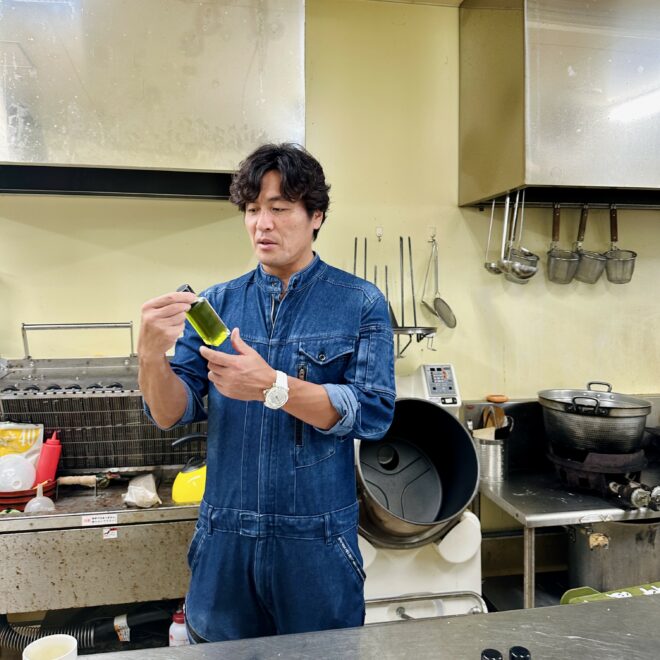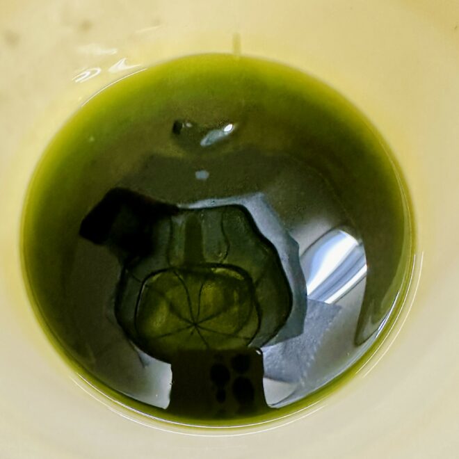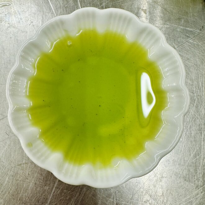 大畑が搾油体験をした早摘みオリーブのオイルは、搾った直後は濃い緑色をしています。青さのある爽やかな香り、ほのかな苦みとピリッとした辛味が特徴。若いグリーンオリーブだけだとえぐみが強く出てしまうので完熟する前の色付いたオリーブを混ぜて味の調整をしています。