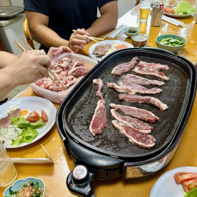 写真上:塩麹に漬けておいたイノシシ肉を焼肉でいただいているところ