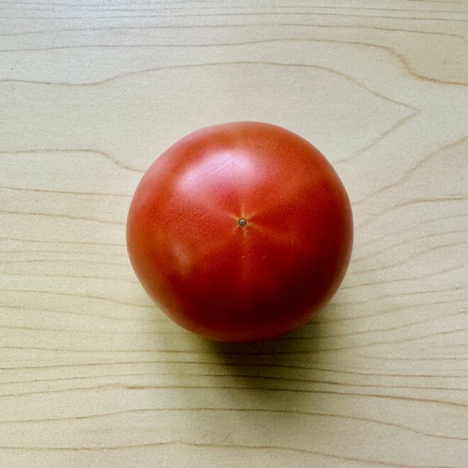 (今や定番の品種「桃太郎」が出回る前の昭和のトマトを思い出し、懐かしい気持ちに。)
