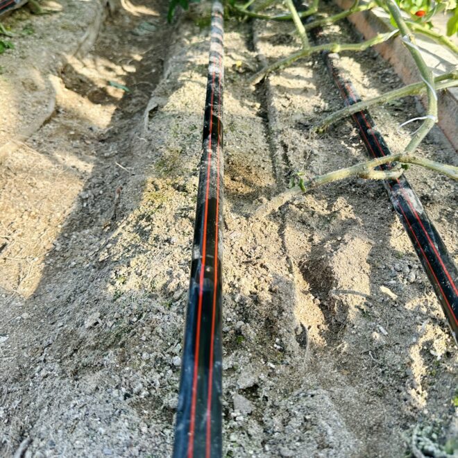 隔離床栽培の苗と水やりのホース