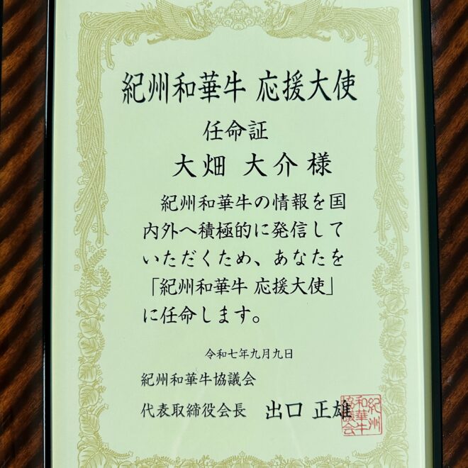 これらを同時に叶える紀州和華牛の取り組みに共感し、この度、大畑大介は紀州和華牛応援大使に就任いたしました(2025年9月)。