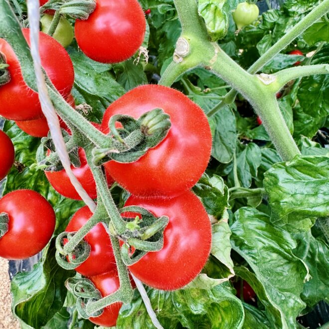真っ赤に色付き収穫を待つばかりのいちごトマト。