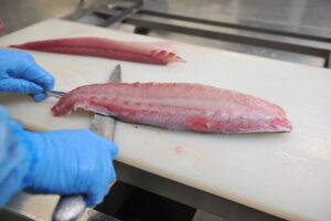 水揚げ直後に、鮮度を保つため、脳天締め、血抜きを行っています。