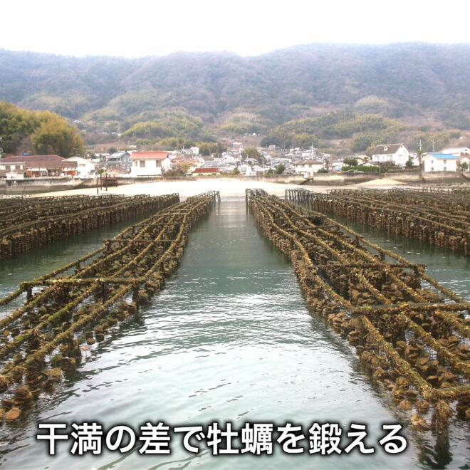 ① 牡蠣の養殖に適したプランクトンの豊富な瀬戸内海。最初の半年は敢えて潮の満ち引きが大きい場所に置き、潮が引いている間、牡蠣を日光に当てます。そうやって鍛えることで強い牡蠣が育つんです。