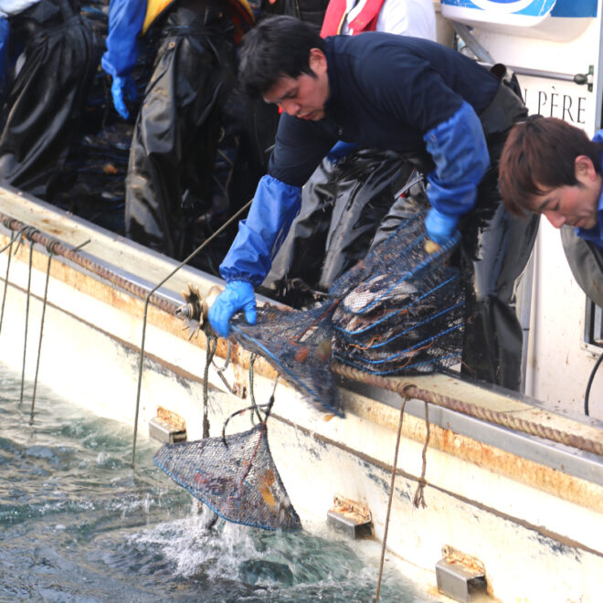 社長自ら漁師として、海に出てほたての収穫を行います。大畑も漁に同行してお手伝いしましたが、ホタテの入っている網を引き上げるのが手作業でかなりの力仕事。どんな仕事もそうですが、その道のプロは皆さんすごいです。