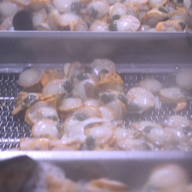 ほたては真水にふれるとおいしさが逃げてしまうため、加工の際は陸奥湾から汲み上げた海水を専用の施設でろ過、殺菌した「滅菌海水」を使用しています。「滅菌海水」の中ではおいしさを閉じこめることができるため、ほたて本来の旨味がぎゅっと凝縮されます。