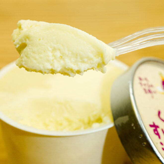 なると金時をそのままアイスにするのではなく、『くりーみぃすいーとぽてと』のペーストを入れてアイスを作っていることがポイントだそう。よりお芋の味を濃厚にするため、アイスができる限界の量までペーストを入れました。そのため、冷凍庫から出してすぐはカチカチなので、少し時間をおいて柔らかくなったら召し上がってください。