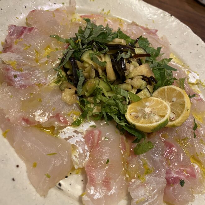 龍馬鯛を昆布締め(正確には市販の昆布茶をまぶして寝かしただけの簡単レシピ)にした和風カルパッチョ!