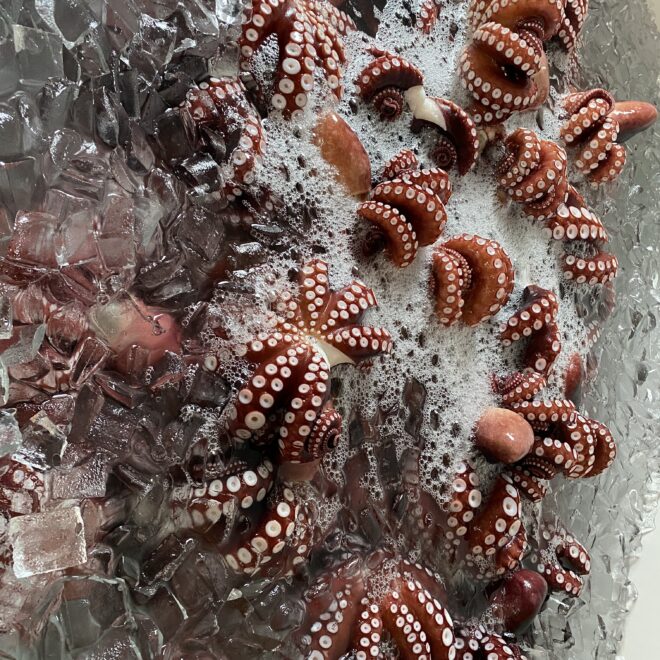 氷で締めた直後の明石だこを食べさせてもらいました。