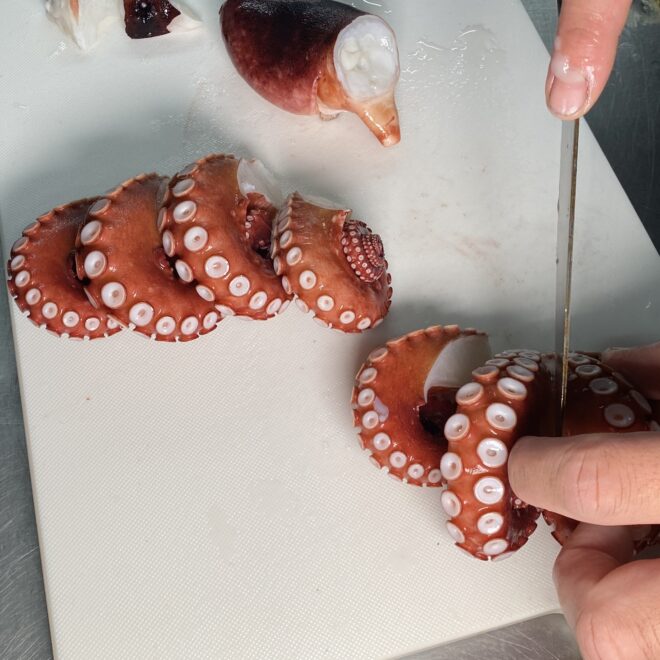 タコをサイズごとに選別し、塩揉みの時間・量を調整します。