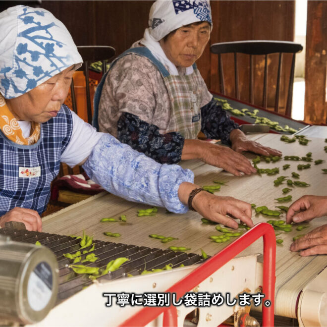 ◆だだちゃ豆も鮮度が大事。鮮度保持袋に入れて出荷します。その際に機械で選別も行いますが、鞘が割れている豆が入らないように、人の目でもしっかり見て、品質管理を徹底しています。