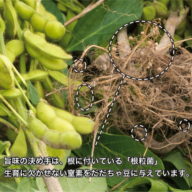◆根っこにプツプツした根粒菌があることで、空気中の窒素をだだちゃ豆に供給し、良い豆ができます。