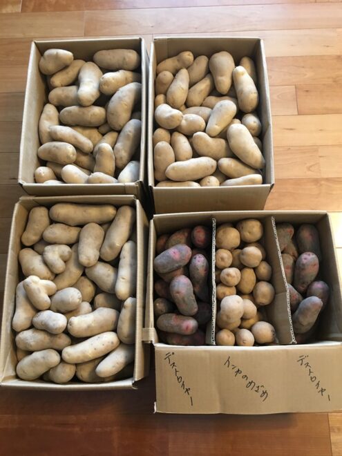 今年は芋の肥大時期に雨が降らず全体的に小ぶりとのことですが、大変ありがたいことにその中でも条件の良い圃場で育ったじゃがいもを大畑大介商店用にご用意いただいているとのことです。