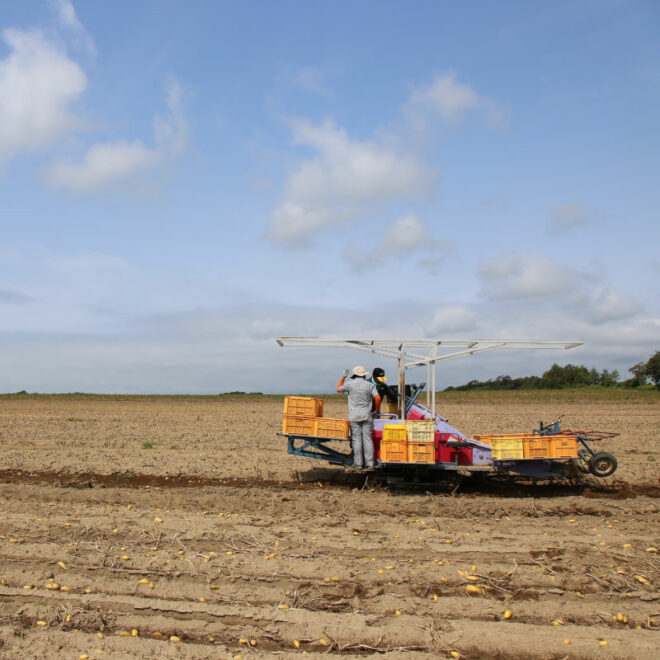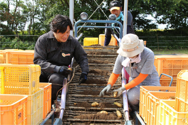 苗の植え付けは(定植)はご夫婦お二人だけで行い、収穫時期はパートさんも含めて数名で行っているそうです。じゃがいもを掘り出す機械に乗って、手作業で一つずつ大きさを分別。