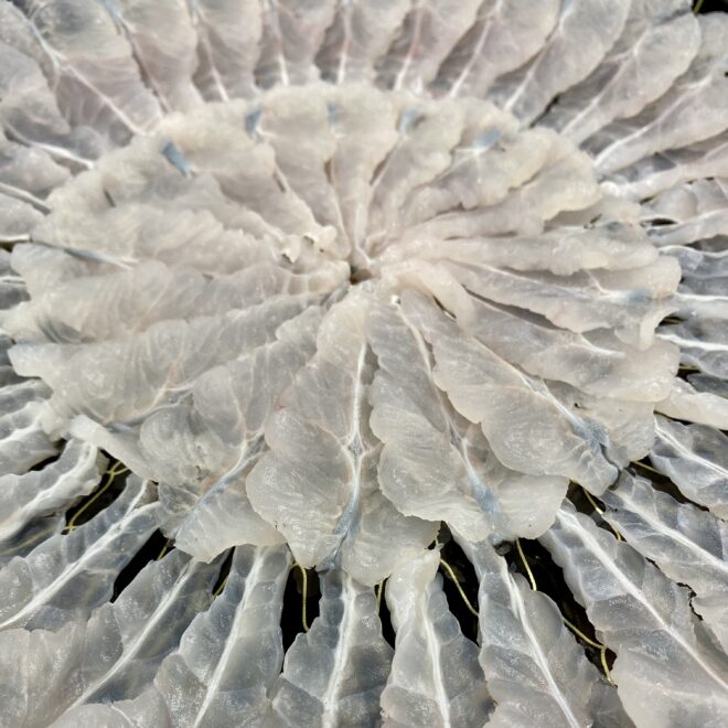 鱧のアラからとった優しいけど、しっかり鱧の旨味が出ている出汁に、職人が丁寧に薄造りにした身を10秒ほどくぐらせたら、お好みでポン酢などで召し上がってください。