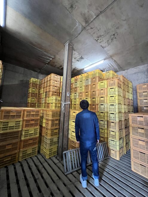 貯蔵庫でばったりお会いした、生産者さんのお一人、松平裕喜さん(右)