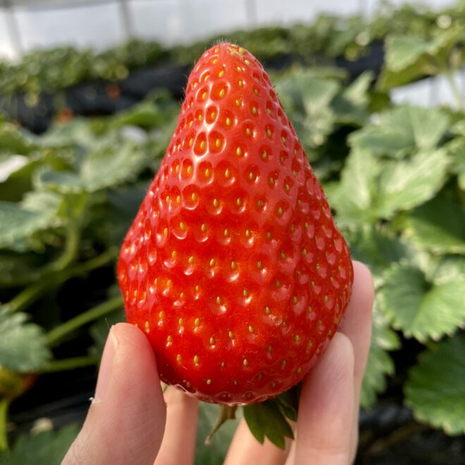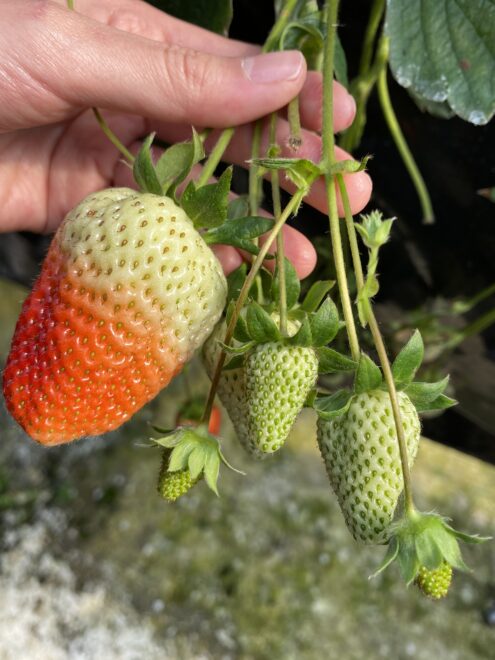 また、一般的にイチゴは先端に行くほど甘くなります。先端から形成され赤くなるのも先端からだからです。