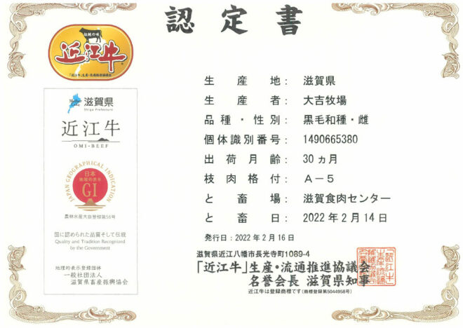 という、特に品質の高い選りすぐりのものを『認証近江牛』とし、このような認定証が発行されます。