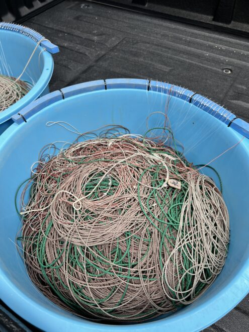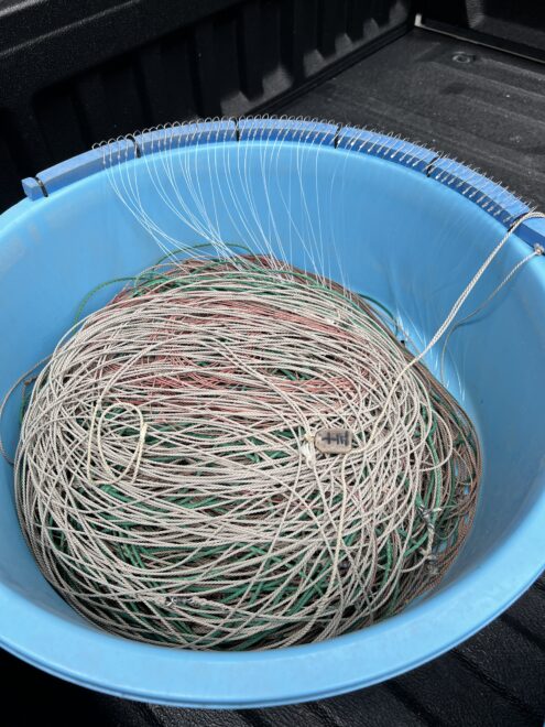 幹縄にはおよそ60本の枝縄がついており、多くてこのうち4割ほどに鱧がかかり、少ないと1匹もかからないことも。