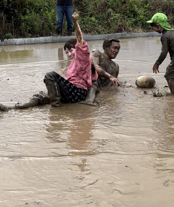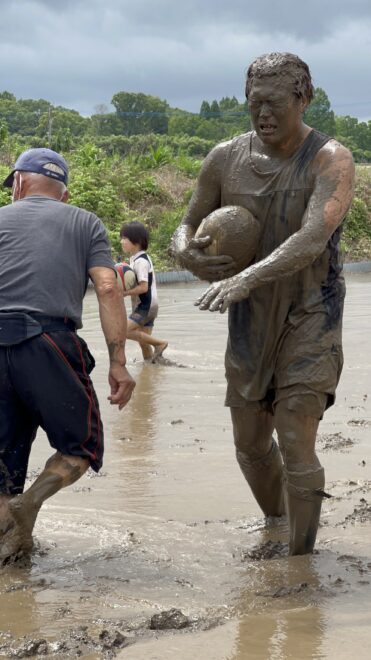 田植えが無事終了し、待ちに待った田んぼラグビーの時間です。