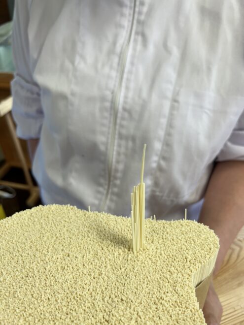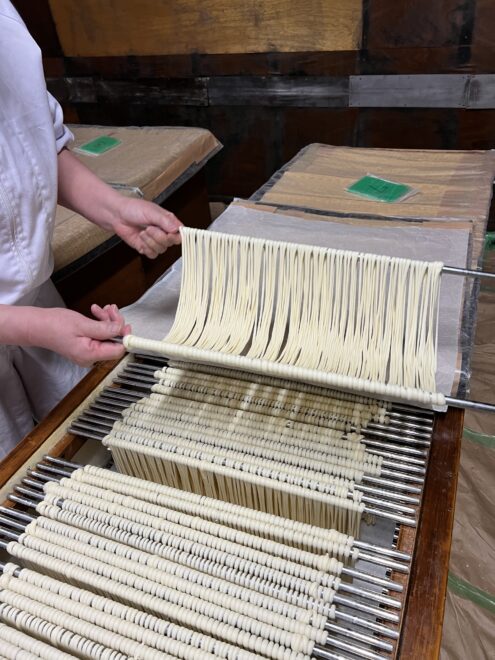 手延べ製法では小麦粉の延びる力のみで、すだれ状態の2m近くまで延ばします。そば粉は延びる力はないため、多く含むと延びにくくなります。