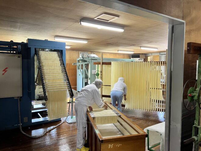 手延べそうめんは非常に工程が多く、早朝から仕込みがスタートし、作業の多くが手仕事で行われています。