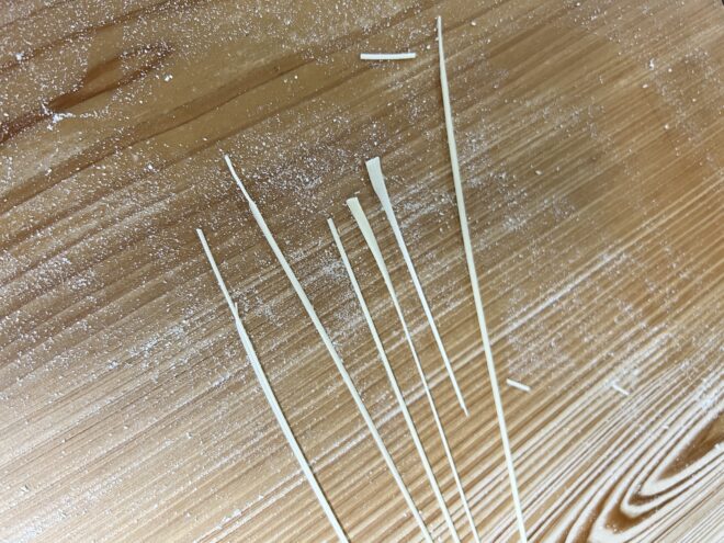 材料を混ぜ合わせた生地をローラーで薄くのばし、細く切って乾燥させたものです。