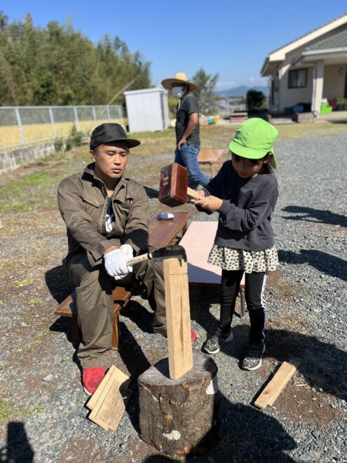 最初は恐る恐る斧を振りかぶっていた子供たちも慣れてくると、もう一回!もっと大きい薪を割りたい!と行列が!サポートをしている、大畑、大西さんも驚きの力強さで次々に薪を割っていきます。