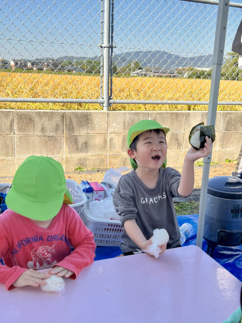子供たちは大きいおにぎりを頬張り、キラキラした笑顔が溢れます。