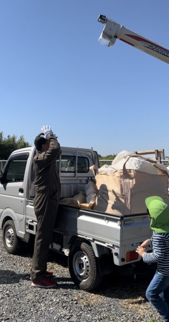 稲穂から分離した籾(もみ)は大きな袋に入れていきます。