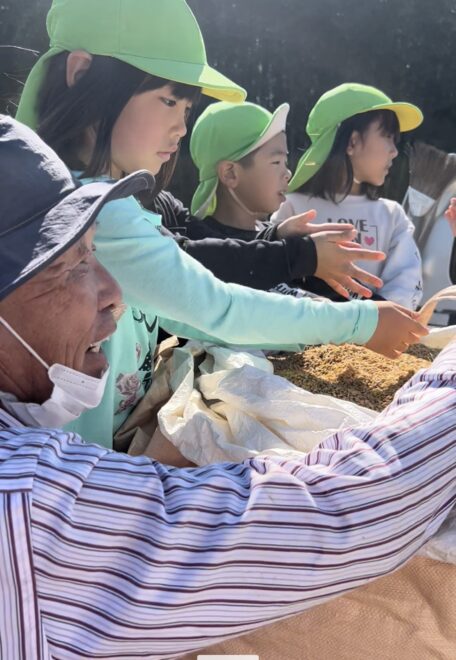 今回も 元ラガーマン 大本商店 南翔悟(ミナミ ショウゴ)さんを始めとした方々のご協力の元、地元の園児の皆さんと稲刈り体験を行ってきました。