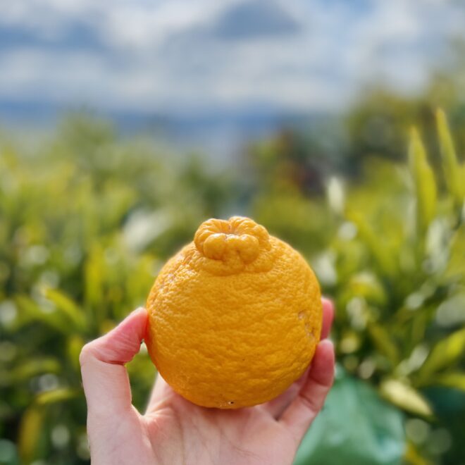 形はデコポンに似ていますが、色は黄味掛かっており、甘さと酸味のバランスが良く、非常にさわやかな後味が特徴です。