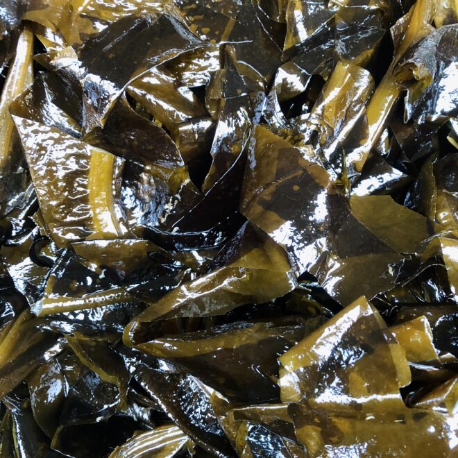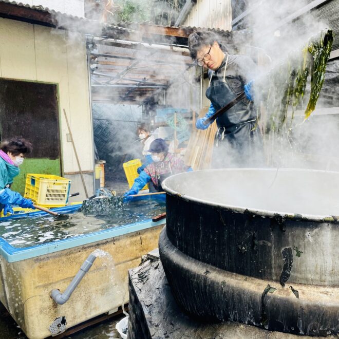 湯浅湾で採れたワカメは煮沸消毒後にアワビのエサとなります。