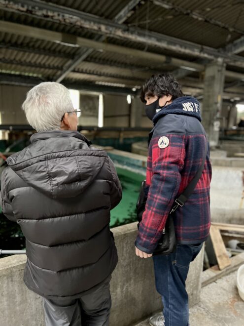 湯浅町漁業生産組合の小松理事(左/シャイなので正面の写真はなし)のお話に聞き入る大畑