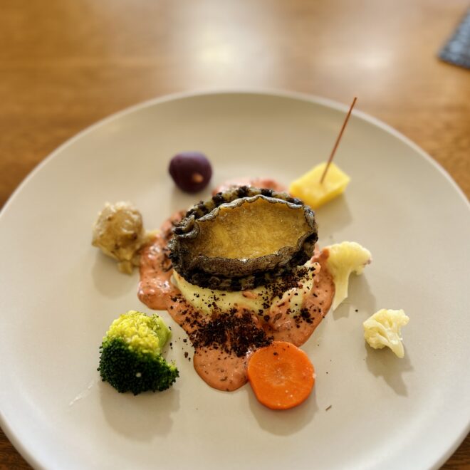 株式会社RIZHの山田部長のご紹介で、フレンチレストラン ナチュラルガーデンの前川シェフに養殖アワビをお料理していただきました。ステーキに添えられたピンク色のソースは梅ソース(!)。