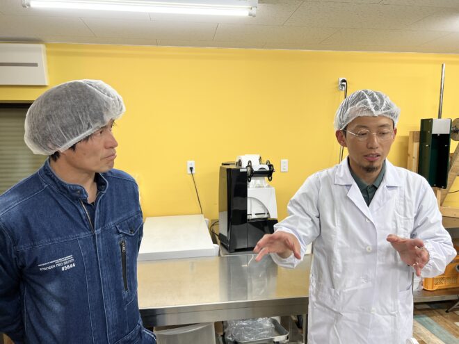 清潔なアイスクリーム工場で雄史さん(右)のお話に聞き入る大畑。