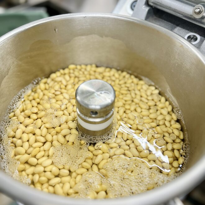 1.浸水地元である長浜市余呉町の美味しい水に大豆を6~12時間浸ける(時間は季節によって調整)。