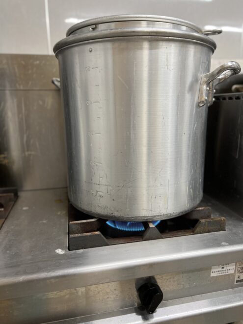絞った生の豆乳を湯煎で温める。湯煎は時間がかかるが濃度が薄まらず、芯まで温まる。