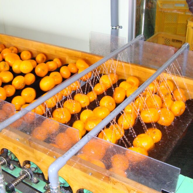 集められた有田みかんはマイナスイオン水で徹底洗浄されます。