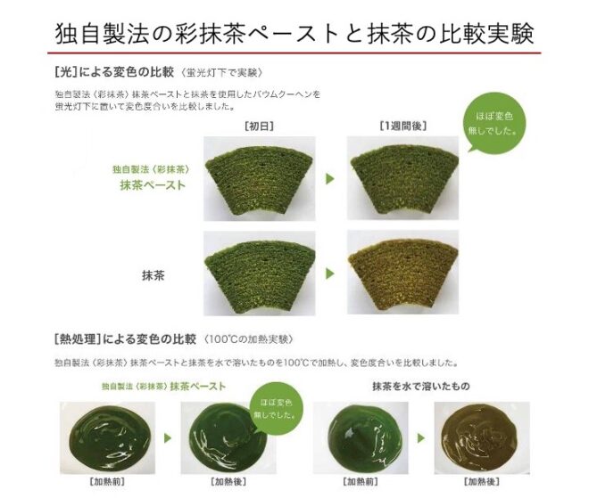 安心・安全の食材な上、ペーストなので保存もしやすく、加熱調理しても、光が当たっても、時間が経ってもほとんど抹茶の色が変わらないんです(もちろん製法にヒミツがあります)。