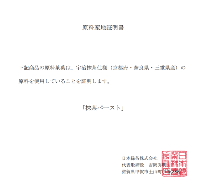 ※宇治抹茶:京都府・奈良県・滋賀県・三重県の4府県産茶を京都府内業者が京都府内において宇治地域に由来する製法により仕上加工した茶を、粉砕・挽臼加工した抹茶