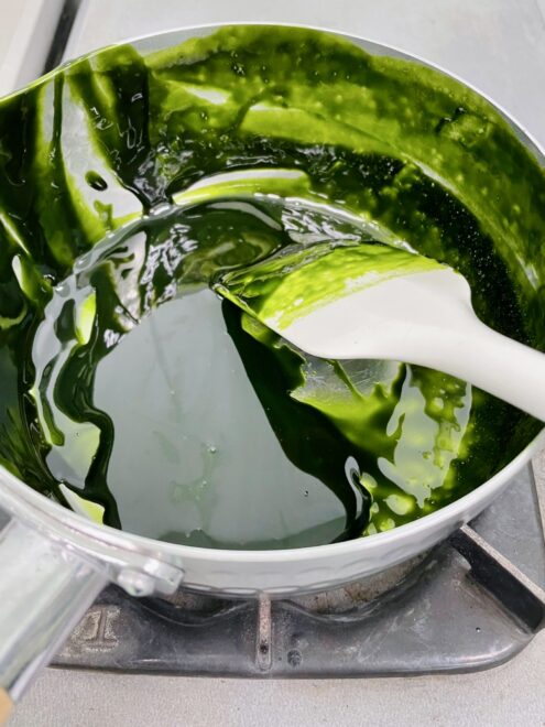 抹茶ペーストにグラニュー糖を加えて加熱した抹茶シロップ。加熱しているのに美しい抹茶色が出ています。またペーストなので、テクスチャーも滑らかで艶々に。