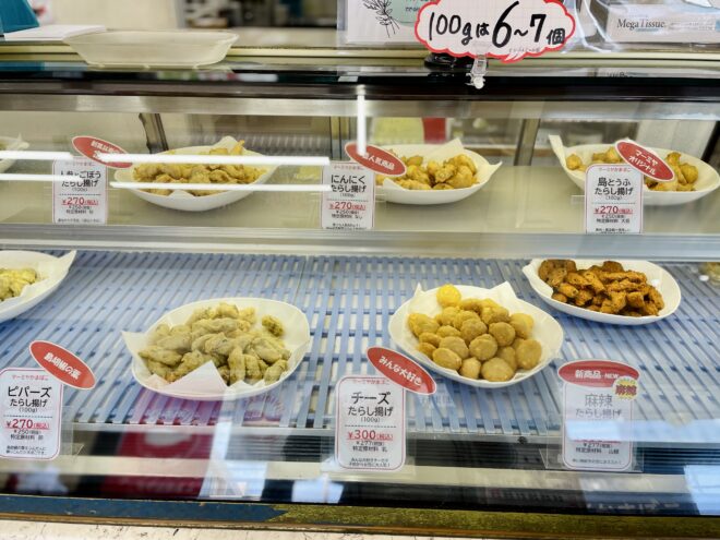 憧れのマーミヤさんの目くるめくラインナップ。石垣島ならではの「島とうふ」、「ピパーズ(ピパーチ)」や「にんにく」、「麻辣」など見かけない種類のかまぼこが沢山並びます。ショーケースにある全種類食べたい!