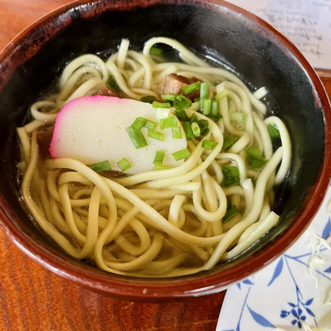 八重山そばは、ねじれのない丸麺か平麺で、かまぼこと三枚肉の短冊切りが載っているのが特徴。お好みでピパーチ(島こしょう)の粉末をかけて食べます。お蕎麦に七味、みたいな感じかな?