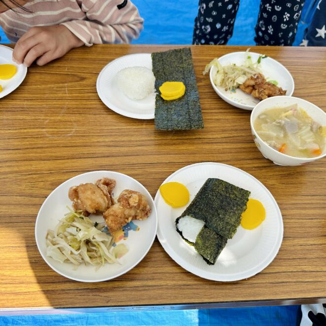 子供たちが大好きなおかずや栄養バランスを考えた副菜や豚汁が用意され、みんなで頂きます。