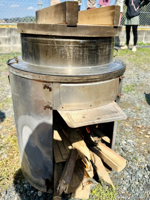 なんとか火が付きました!かまどでお米を炊く際の火加減や時間は大野保育園の園長さんが心得ています。「適当です」なんて仰っていましたが・・・・。