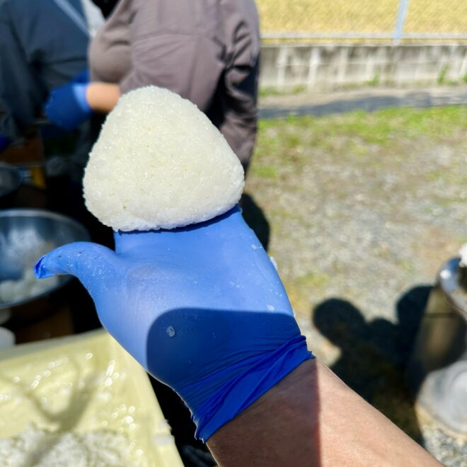 炊きあがったお米は保育園の先生たちと大畑の手でおにぎりに。