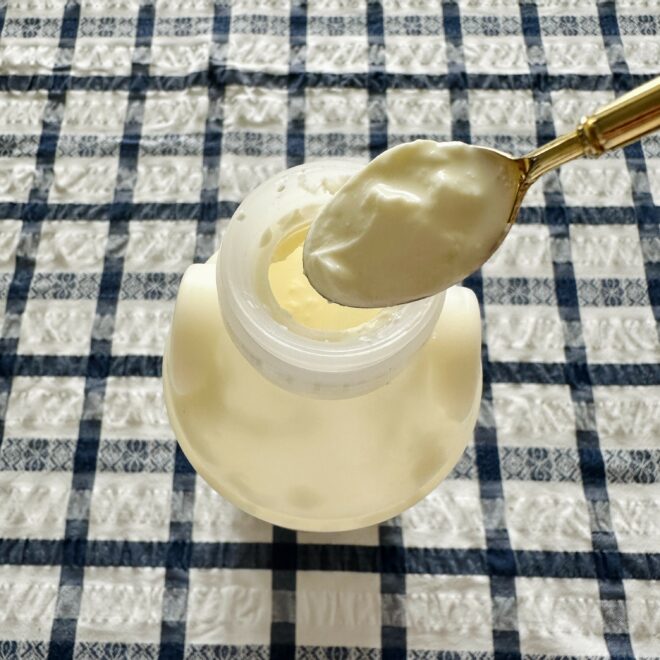 乳脂肪分が多いジャージーミルクはノンホモ製法の場合、クリームが浮いてくることがあります。気になる方は飲む前によく振ってください。この写真は冬に撮りました(冬はミルクが濃厚でクリームが多い)。