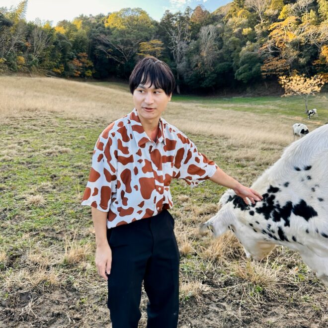 若き4代目牧場主、須藤健太さん。牛たちには一頭一頭に名前が付いていて、須藤さんは全員の名前を覚えています。ユニフォームも牛とおそろい!