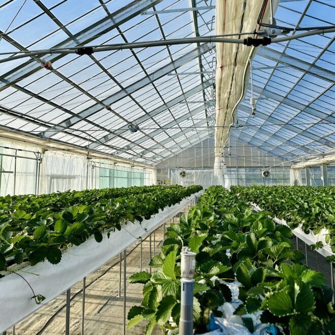 ほしうらら、白いイチゴのエンジェルエイト、甘くて子供たちに大人気のももいちご、紅ほっぺ、とちおとめなど様々な種類を生産者さんに協力してもらいながら育て、2024年から本格稼働できるようになってきたといいます(10tくらい採れるといいな~、と仰っていました)。